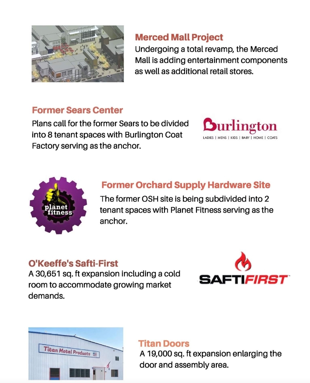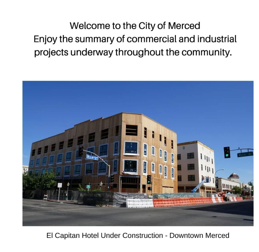 El Capitan hotel, the Tioga, Mainzer Theatre, Merced Gateway Center, Campus Parkway Plaza, Merced Mall project, Burlington at old Sears building, and Planet Fitness at old Orchard Supply building.