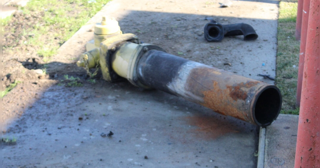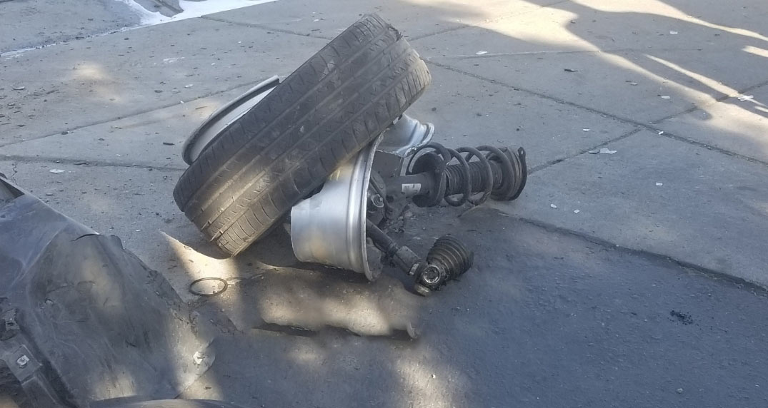 The grey-colored Chrysler hit a fire hydrant before rolling over and hitting a parked black-colored convertible Camaro at Merced Tire and Wheels